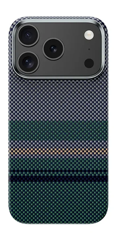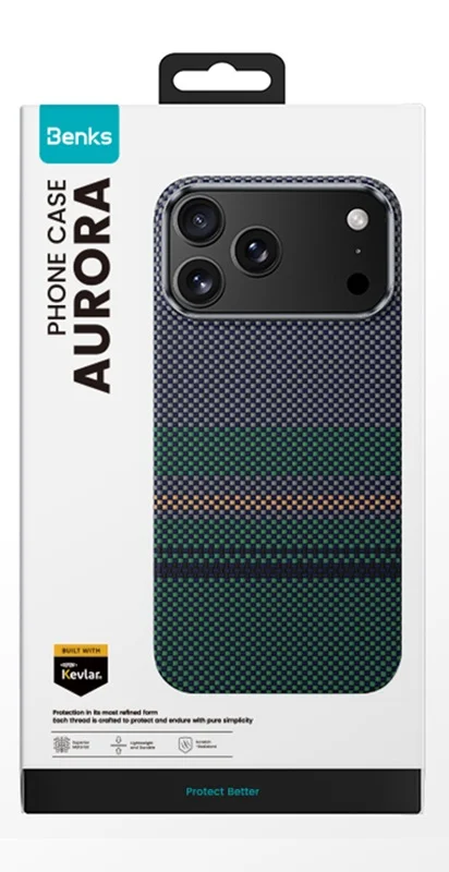 Dėklas ,,Benks iPhone 17 Pro Max Armor Air Aurora Kevlar'' pasižymi unikaliu mėlynų, ryškių žalių ir oranžinių atspalvių deriniu, atspindinčiu Šiaurės pašvaistes grožį.