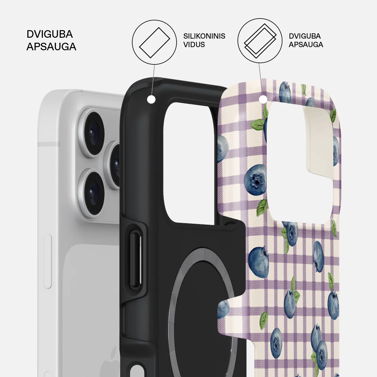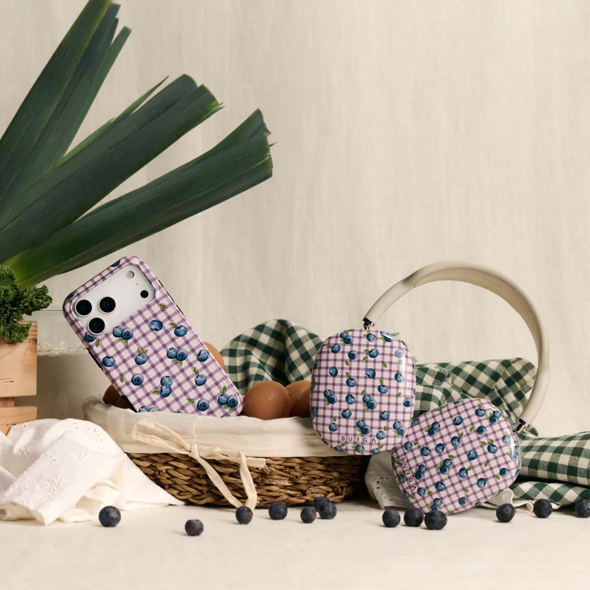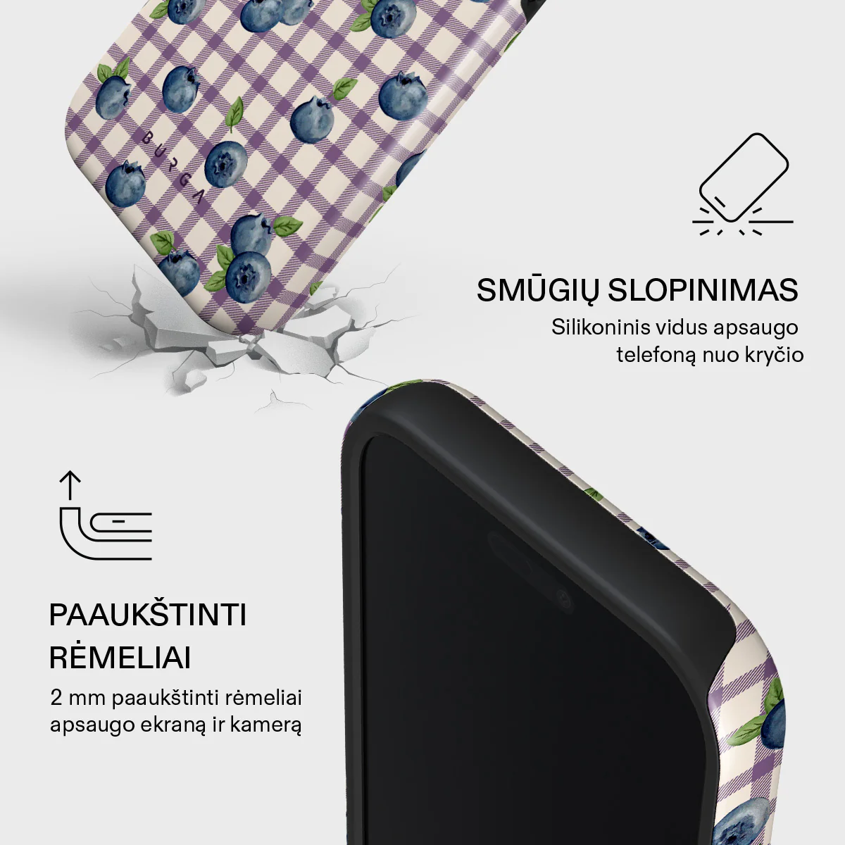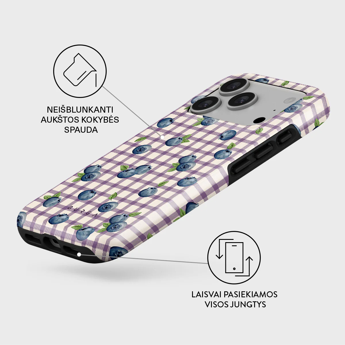„Burga Blueberry Muffin“ dėklas yra tarsi mažas vasaros gabalėlis, įamžintas elegantiškame dizaine. Švelni violetinių ir baltų langelių kompozicija primena lengvą, romantišką pikniko audinį, ant kurio pabirusios sultingos mėlynės. Visas dizainas alsuoja vasarišku lengvumu, saldumu ir jaukumu - šviežių uogų aromato ir ramybės. Toks derinys suteikia Jūsų ,,iPhone 17 Pro Max“ išskirtinio stiliaus ir saldžios vasariškos energijos.