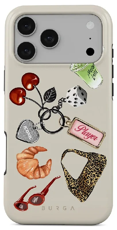 Šviesiai pilkame fone išsibarstė akiniai nuo saulės, lūpų dažai, matcha gėrimas, kruasanas, leopardo rašto krepšys, raktų pakabukas. „It Girl" iPhone 17 Pro Max telefono dėklo dizainas - žaismingas ir drąsus, jis puikiai tinka tiems, kurie mėgsta paprastus, bet ryškius dalykus. Burga - ne tik apsaugos jūsų mobilųjį telefoną, bet ir pavers jį madingu aksesuaru!