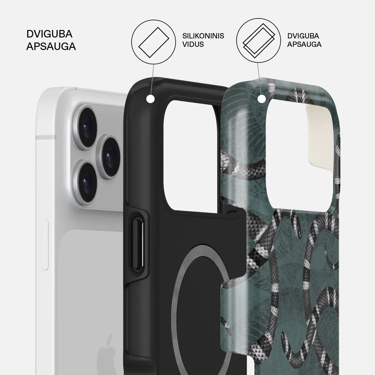 • Dviejų sluoksnių apsauga: Vidinis silikoninis sluoksnis absorbuoja smūgius. Išorinis kietas apvalkalas užtikrina papildomą atsparumą.