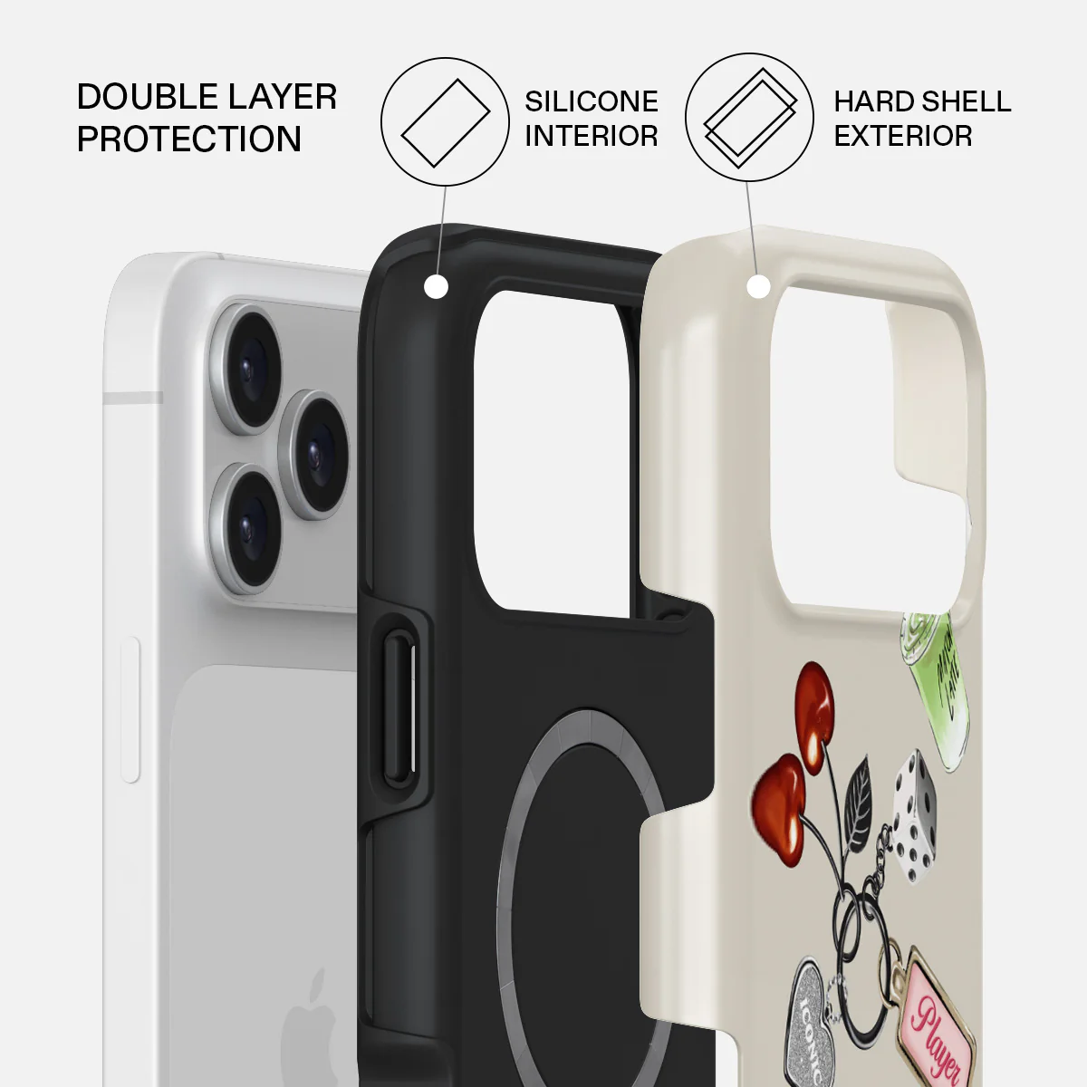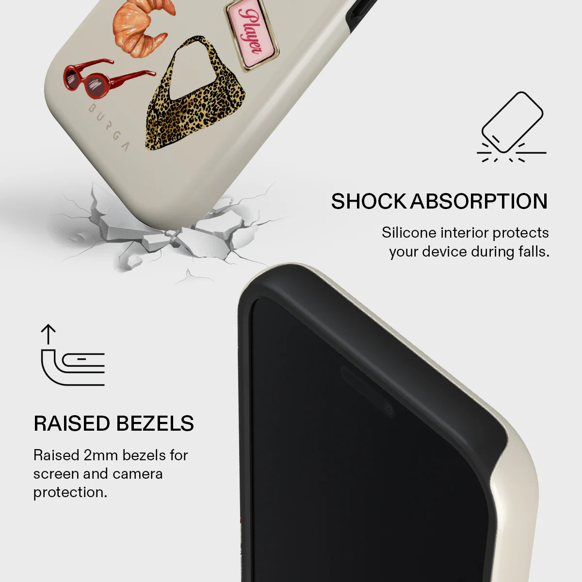 Šviesiai pilkame fone išsibarstė akiniai nuo saulės, lūpų dažai, matcha gėrimas, kruasanas, leopardo rašto krepšys, raktų pakabukas. „It Girl" iPhone 17 Pro telefono dėklo dizainas - žaismingas ir drąsus, jis puikiai tinka tiems, kurie mėgsta paprastus, bet ryškius dalykus. Burga - ne tik apsaugos jūsų mobilųjį telefoną, bet ir pavers jį madingu aksesuaru!