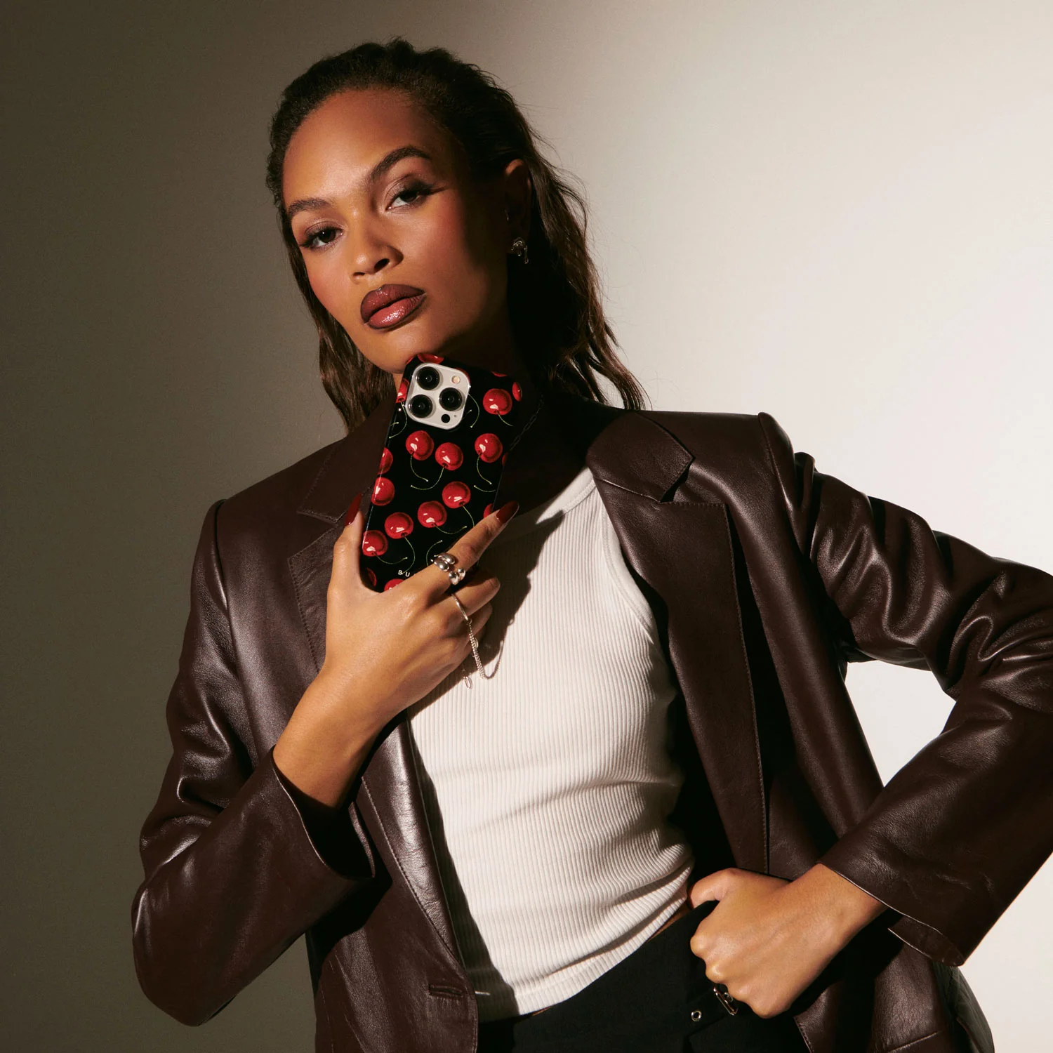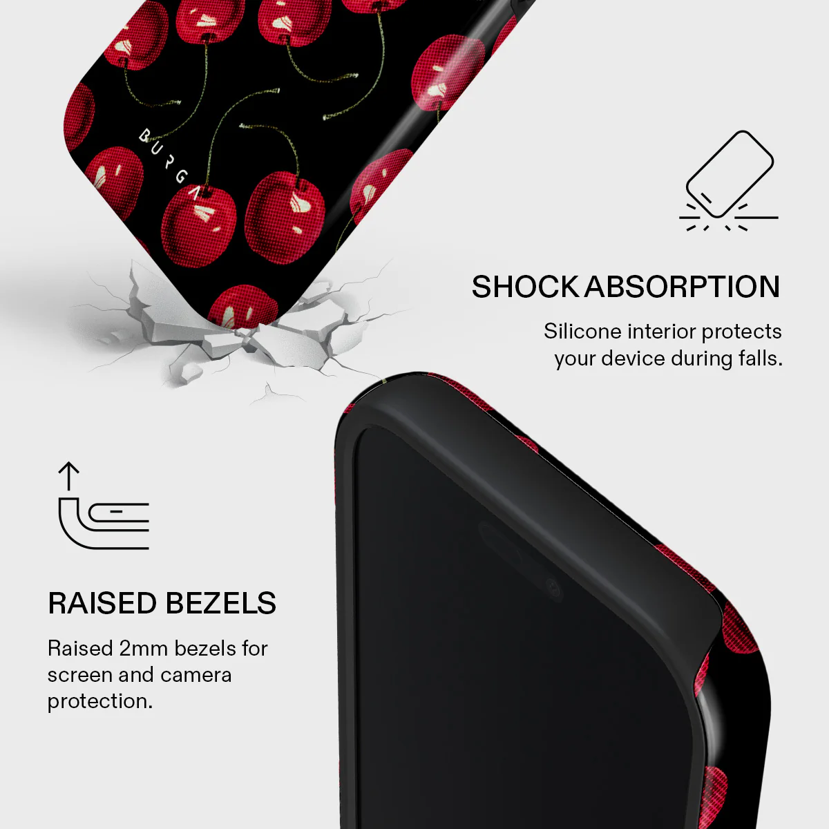 Sodriame juodame fone išsiskiria sodrios raudonos vyšnios. „Cherrybomb iPhone 17 Pro“ telefono dėklo dizainas - viliojantis ir drąsus, jis puikiai tinka tiems, kurie mėgsta paprastus, bet ryškius dalykus. Burga - ne tik apsaugos jūsų mobilųjį telefoną, bet ir pavers jį madingu aksesuaru!