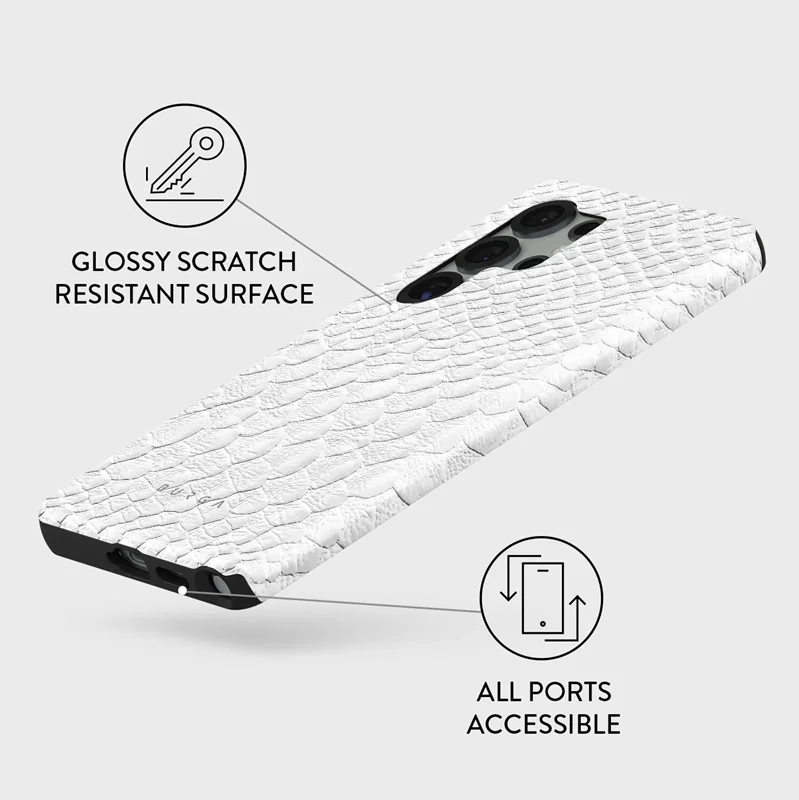 ,,Burga Samsung Galaxy S25 Ultra Tough" dėklas ,,Glacial Desert" pasižymi ledyno baltos spalvos gyvatės odos dizainu. Pavojingi gyvūnų raštai suteiks Jūsų stiliui pasitikėjimo ir prabangos, o telefoną pavers madingu aksesuaru. Šis dėklas ne tik suteiks jūsų telefonui prabangų ir stilingą įvaizdį, bet tvirtai apsaugos nuo įbrėžimų ir skilimų.