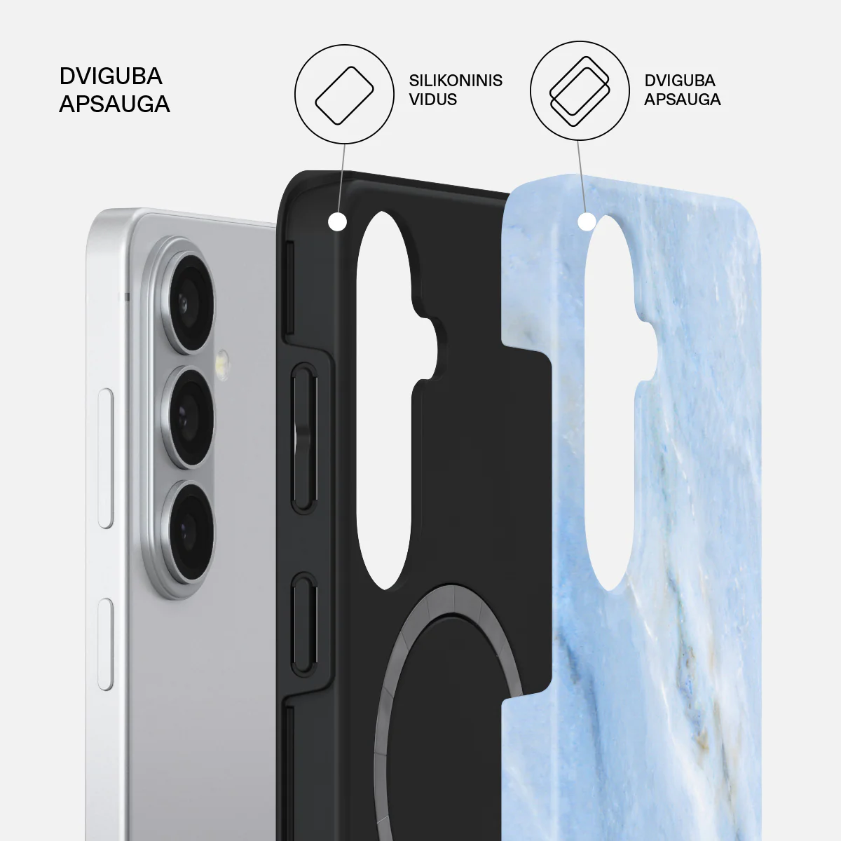 • Dviejų sluoksnių apsauga: Vidinis silikoninis sluoksnis absorbuoja smūgius. Išorinis kietas apvalkalas užtikrina papildomą atsparumą.