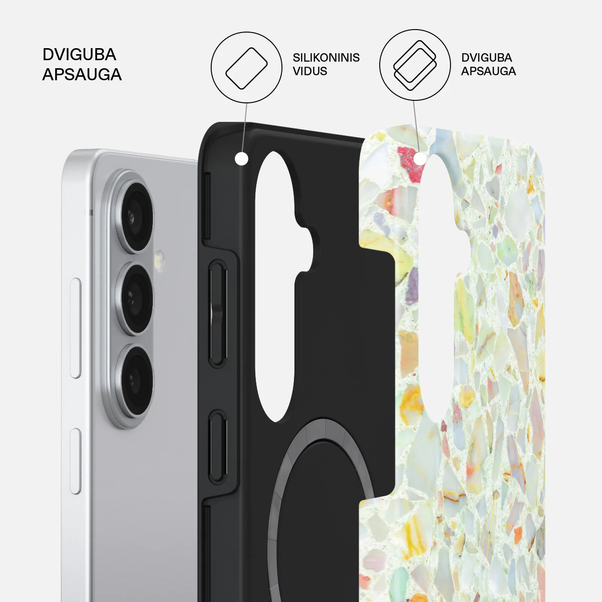 • Dviejų sluoksnių apsauga: Vidinis silikoninis sluoksnis absorbuoja smūgius. Išorinis kietas apvalkalas užtikrina papildomą atsparumą.