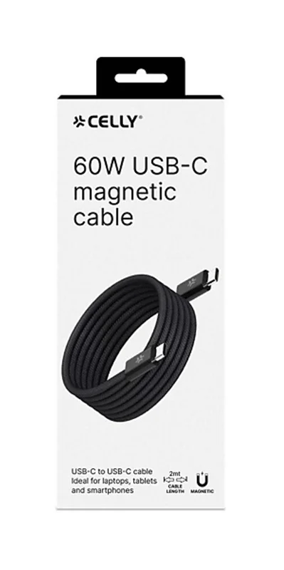 Įkraukite ir perduokite duomenis patogiai su ,,Celly Magnetic USB-C į USB-C, 2m - 60W'' laidu!