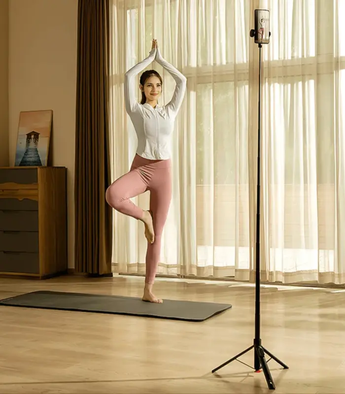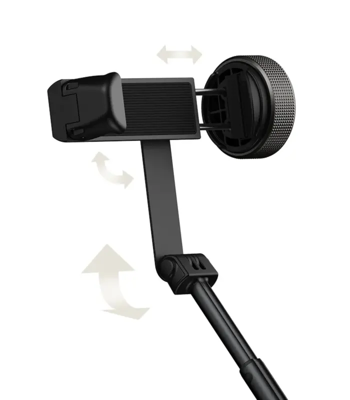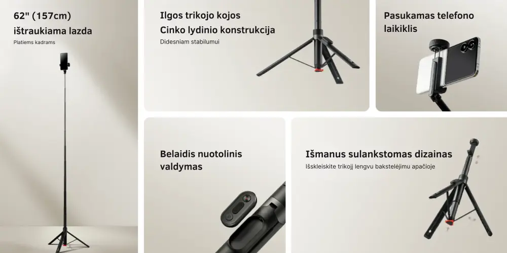 • Besirotuojantis laikiklis: Integruotas telefono laikiklis leidžia lengvai perjungti portreto ir peizažo režimus bei reguliuoti pasvirimo kampą kūrybiškiems kadrams.