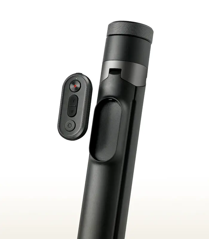 • Daugiafunkcis Bluetooth pultelis: Valdykite priartinimą (zoom), perjunkite tarp priekinės ir galinės kameros ar keiskite foto/video režimus pulteliu. Jis magnetiškai prisitvirtina prie rankenos, todėl niekada nepasimes.